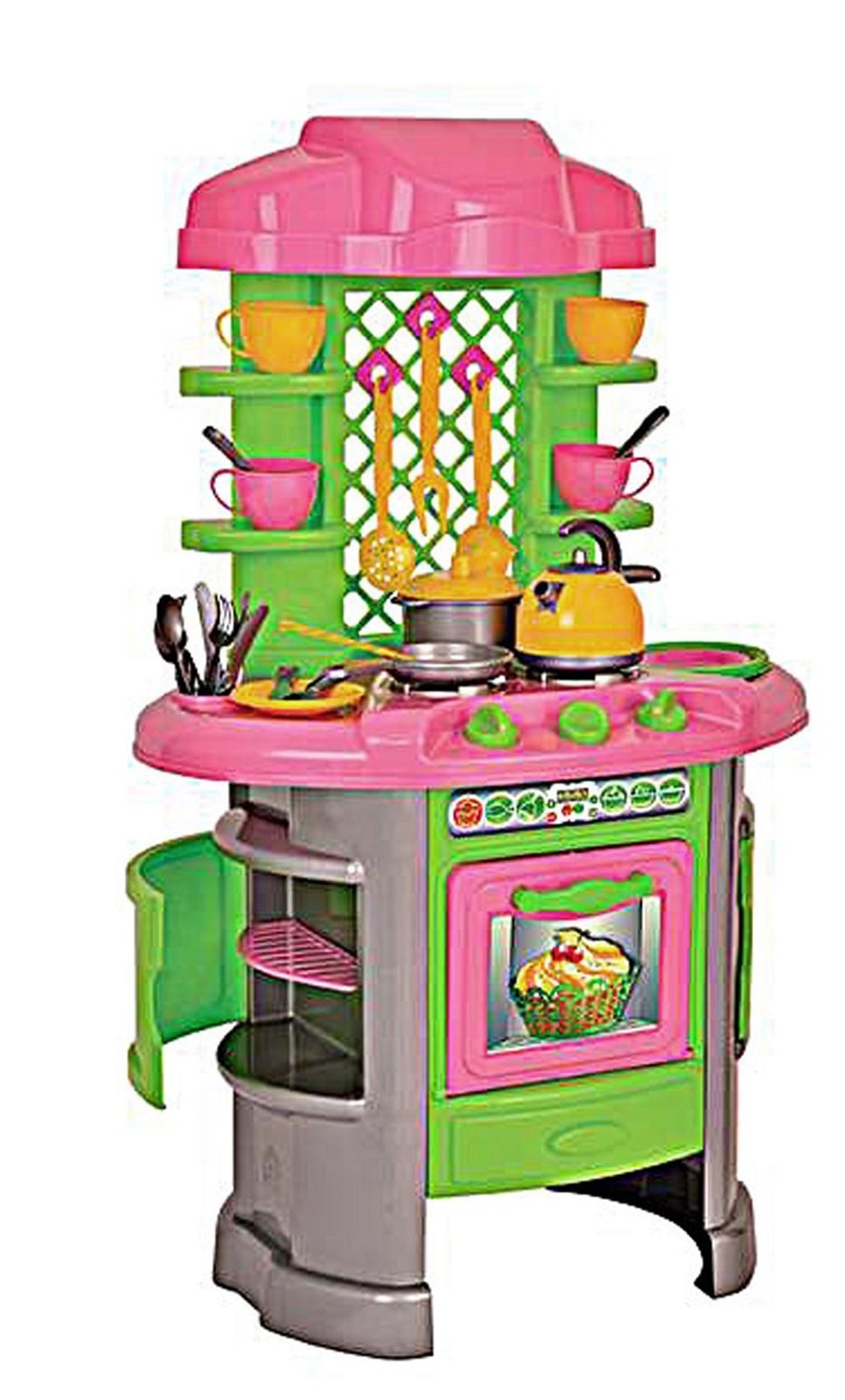 Игровой набор включает в себя: варочную поверхность с 3 конфорками, духовой шкаф с открывающейся дверцей, вытяжку, мойку с поворачивающимся краном, кастрюлю с крышкой, чайник, сковородку и прочие принадлежности. Все детали выглядят очень реалистично и выполнены из яркой пластмассы высокого качества.