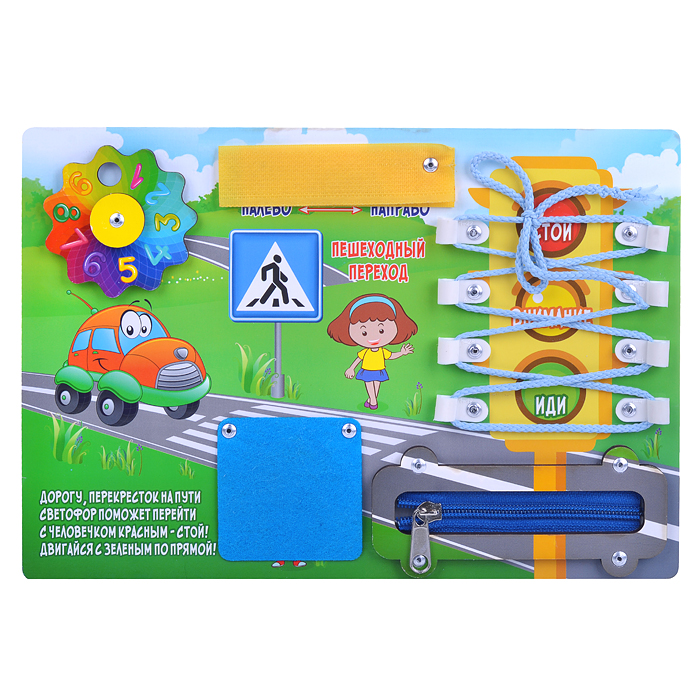 На доске располагаются различные элементы, такие как: липучки, замки, молнии, шнуровки.