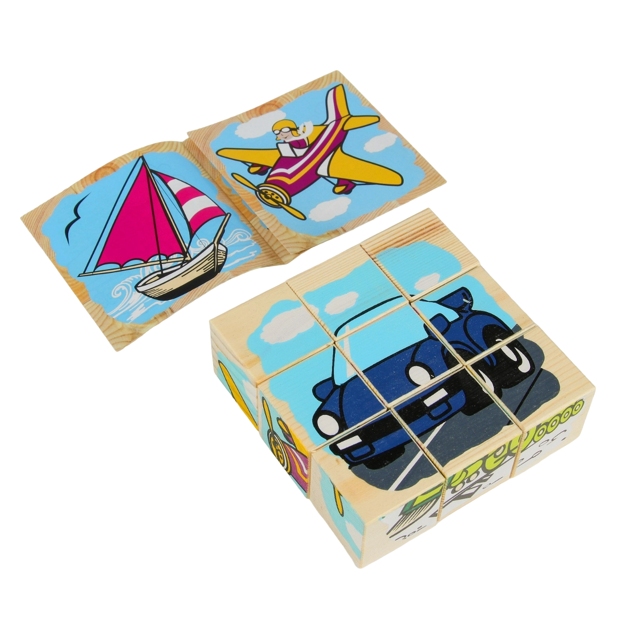 9 красочных кубиков с изображением различных видов транспорта, которые нужно сложить в целую картинку. В изготовлении применена высококачественная древесина хвойных пород.
