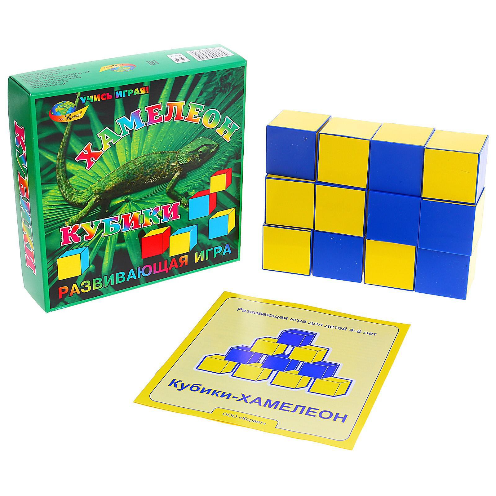 Все кубики одинаковы, у каждого три грани, сходящиеся в одной вершине – окрашены одним цветом (синим), а три следующие – другим цветом (желтым).