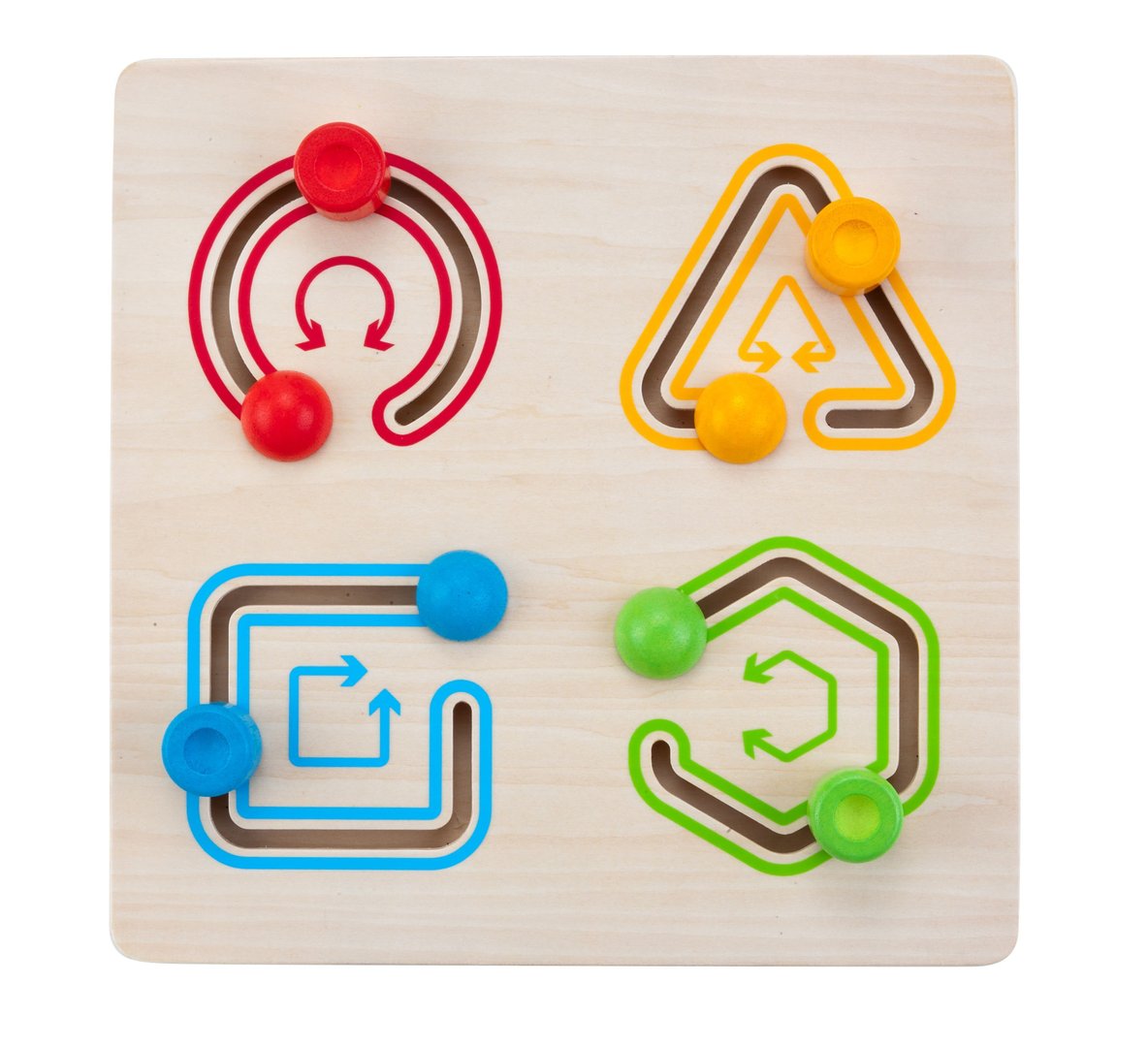На лицевой стороне панели расположены 4 лабиринта различной геометрической формы: треугольник, квадрат, круг и шестиугольник.