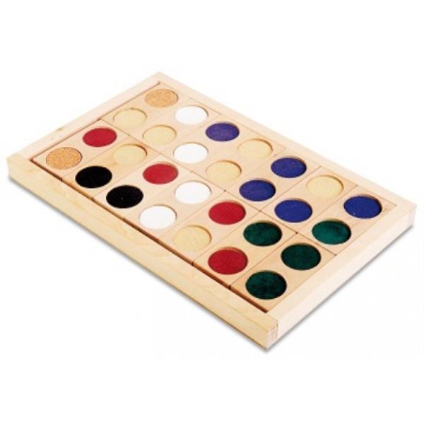 - 28 деревянных плашек 9 х 4,3 см с различными фактурами поверхности (лен, шерсть, поролон, сетка, шпагат, наждачная бумага, войлок и вельвет) и цветовой индикацией (каждый тип покрытия окрашен в свой оттенок).